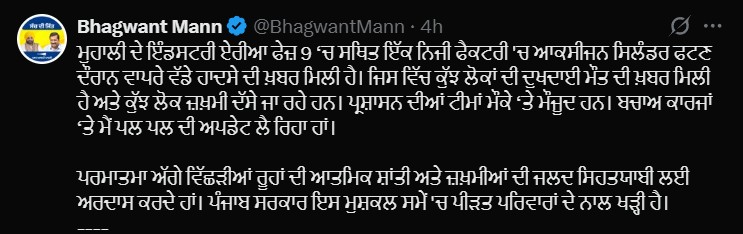 CM भगवंत मान ने घटना पर शोक जताया है। पता चला है कि फैक्ट्री में ऑक्सीजन सिलेंडर लोड किए जा रहे थे। इसी दौरान अचानक सिलेंडर में ब्लास्ट हो गया। सूचना मिलते ही मोहाली के SSP हरमनदीप सिंह हंस मौके पर पहुंचे। उन्होंने स्थिति का जायजा लिया। यह धमाका इतना खतरनाक था कि मारे गए लोगों के चिथड़े तक उड़ गए।