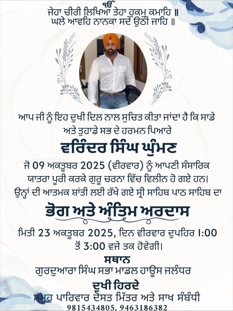 जालंधर में आज बॉडी बिल्डर और एक्टर वरिंदर सिंह घुम्मन का भोग और अंतिम अरदास आज 23 अक्टूबर मॉडल हाउस स्थित गुरुद्वारा सिंह सभा जालंधर में होगी। परिवार ने फेसबुक पर पोस्टर जारी कर भोग एवं अंतिम अरदास की जानकारी साझा की है। इस मौके पर परिवार, प्रशंसक और कलाकार साथी घुम्मन को श्रद्धांजलि देंगे। बता दें कि वरिंदर सिंह घुम्मन का 9 अक्टूबर को हार्ट अटैक से निधन हो गया था।