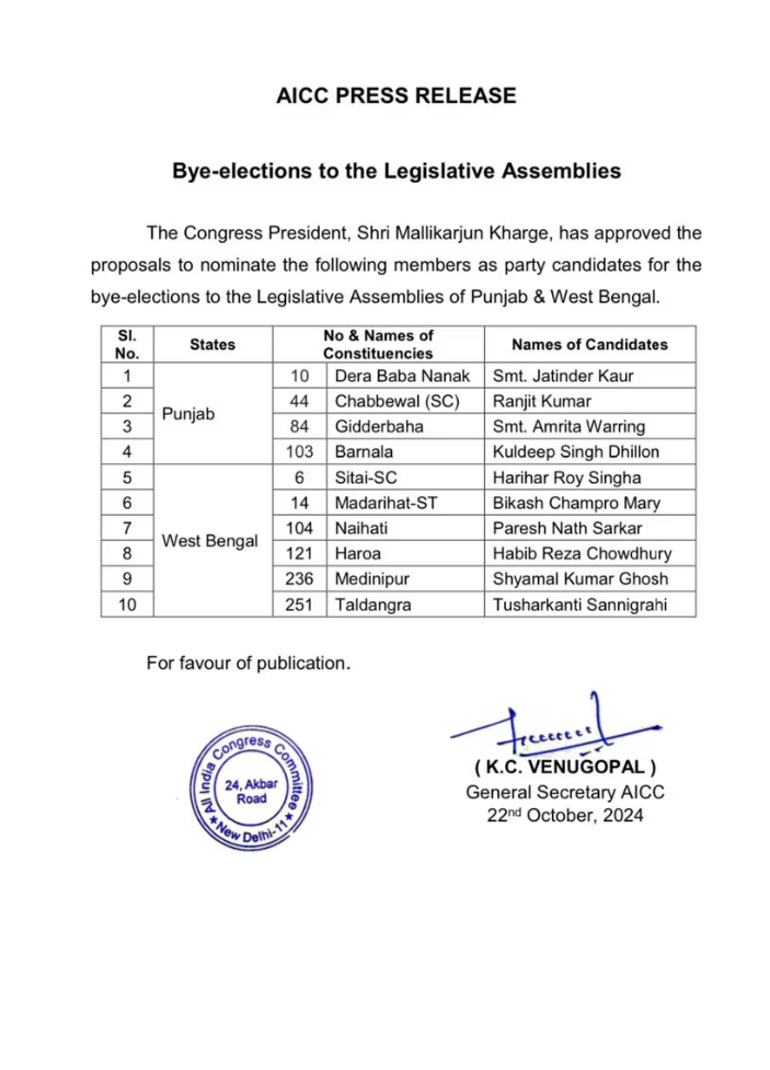 pb8 live news : कांग्रेस ने आम चुनाव के लिए उम्मीदवारों की सूची जारी कर दी है। अमृता वारिंग गिद्दड़बाहा से चुनाव लड़ेंगी। डेरा बाबा नानक से जतिंदर कौर, बरनाला से कुलदीप सिंह ढिल्लों और चाबेवाल से रणजीत कुमार को उम्मीदवार घोषित किया गया है।इससे पहले कल आम आदमी पार्टी (आप) ने पंजाब की चार विधानसभा सीटों पर होने वाले उपचुनाव के लिए उम्मीदवारों के नामों की घोषणा की। आप के राष्ट्रीय महासचिव डाॅ. संदीप पाठक द्वारा जारी सूची के अनुसार, विधानसभा क्षेत्र गिद्दड़बाहा से हरदीप सिंह डिंपी ढिल्लों, बरनाला से हरिंदर सिंह धालीवाल, चाबेवाल (एससी) से इशांक चाबेवाल और डेरा बाबा नानक से गुरदीप सिंह रंधावा को मैदान में उतारा गया है।