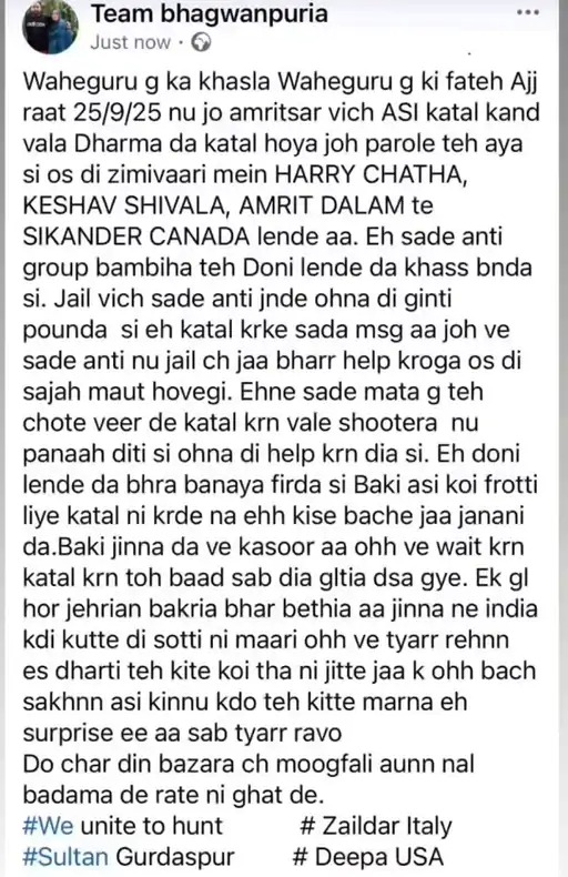 अमृतसर में 2012 के चर्चित ASI रविंदर पाल हत्याकांड के दोषी की गोलियां मारकर हत्या, जग्गू भगवानपुरिया गैंग की पोस्ट ने मचाई दहशत