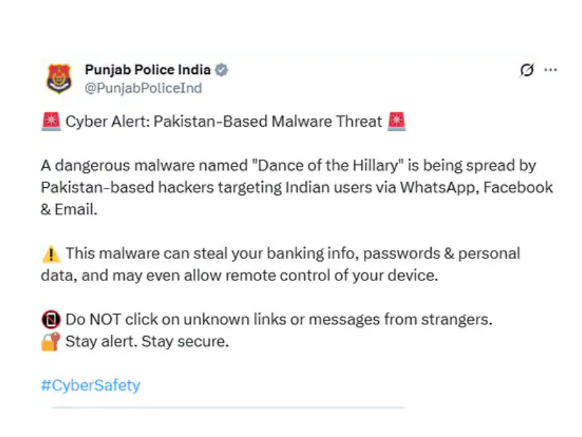 pb8 live news : पंजाब पुलिस ने राज्य के लोगों को पाकिस्तान से होने वाले साइबर हमलों के प्रति सचेत किया है। पंजाब पुलिस की ओर से जारी अलर्ट में पाकिस्तानी साइबर हमलावरों द्वारा साइबर हमलों को लेकर अलर्ट जारी किया गया है। इस संबंध में पंजाब पुलिस ने लोगों से सतर्क रहने को कहा है। साथ ही किसी भी अज्ञात लिंक पर क्लिक न करने के निर्देश भी दिए गए हैं। पंजाब पुलिस की ओर से जारी अलर्ट में कहा गया है कि पाकिस्तान स्थित हैकर्स द्वारा व्हाट्सएप, फेसबुक और ईमेल के जरिए भारतीय यूजर्स को निशाना बनाया जा रहा है, जिसमें ‘डांस ऑफ द हिलेरी’ नामक खतरनाक मैलवेयर फैलाया जा रहा है। यह मैलवेयर आपकी बैंकिंग जानकारी, पासवर्ड और व्यक्तिगत डेटा चुरा सकता है। यह आपके डिवाइस को रिमोट कंट्रोल करने की भी अनुमति दे सकता है। अज्ञात लिंक या अज्ञात लोगों के संदेशों पर क्लिक न करें। ताकि आप उसके हमले से खुद को बचा सकें।