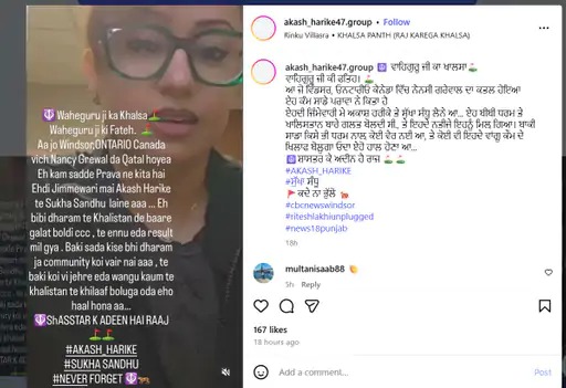 कनाडा के विंडसर (ओंटारियो) में पंजाबी इन्फ्लुएंसर, सिंगर और नर्स नैन्सी ग्रेवाल की हत्या कर दी गई। इस हत्याकांड की जिम्मेदारी गैंगस्टर आकाश हरिके और सुखा संधू ने सोशल मीडिया पोस्ट के जरिए ली है। पोस्ट में दावा किया गया कि नैन्सी धर्म और खालिस्तान के खिलाफ बोलती थी, इसलिए उसे मारा गया। हालांकि इस दावे की स्वतंत्र पुष्टि नहीं हुई है।