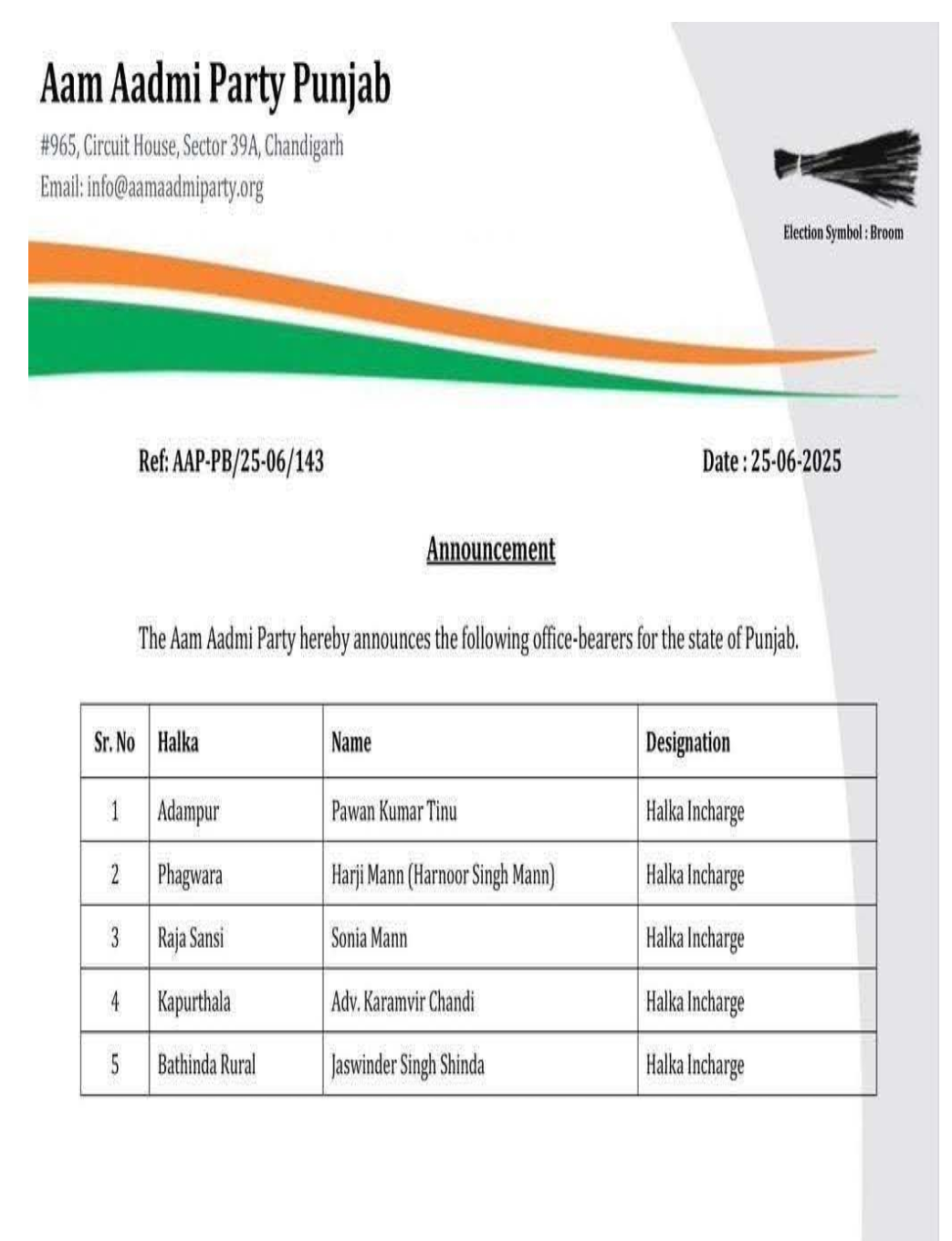 JALANDHARपंजाब : ''आप'' में हलका इंचार्जों की नियुक्ति