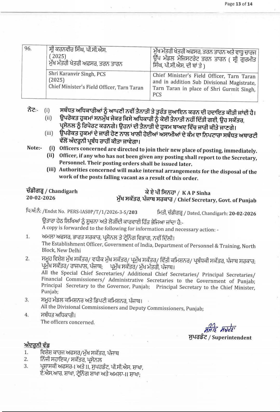 पंजाब सरकार ने बजट पेश होने से ठीक पहले बड़ा प्रशासनिक फेरबदल करते हुए 96 अधिकारियों के तबादले कर दिए हैं। जारी आदेश के अनुसार 9 आईएएस और 87 पीसीएस अधिकारियों को नई जिम्मेदारियां सौंपी गई हैं।