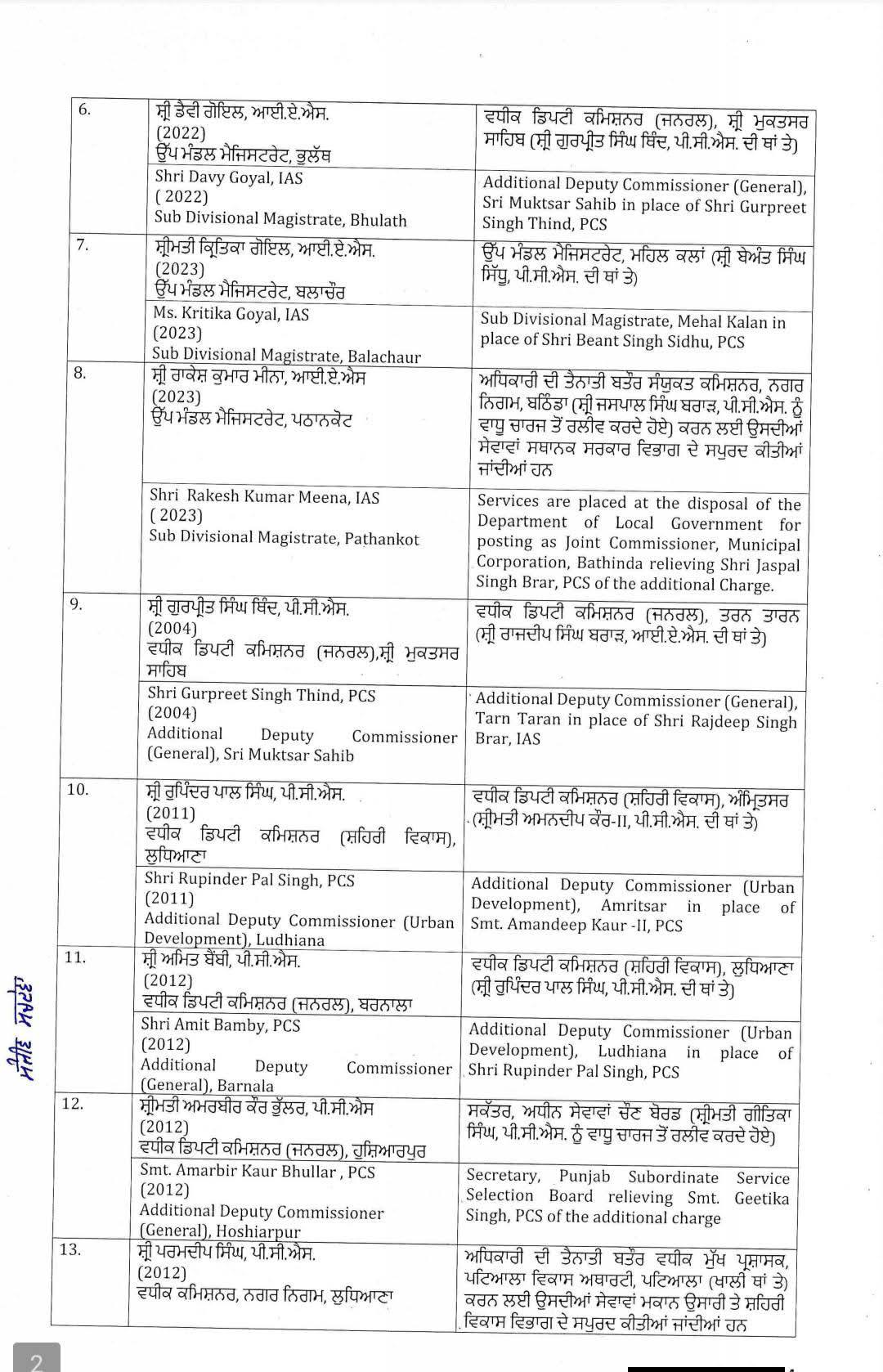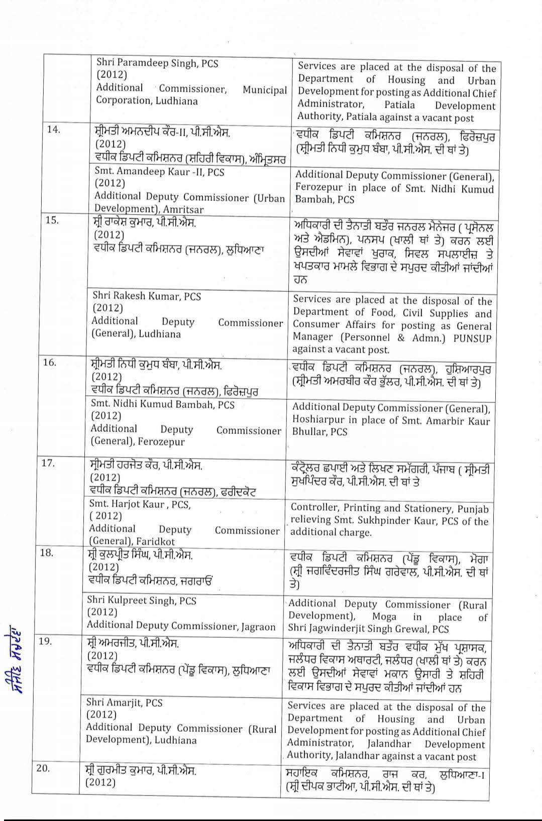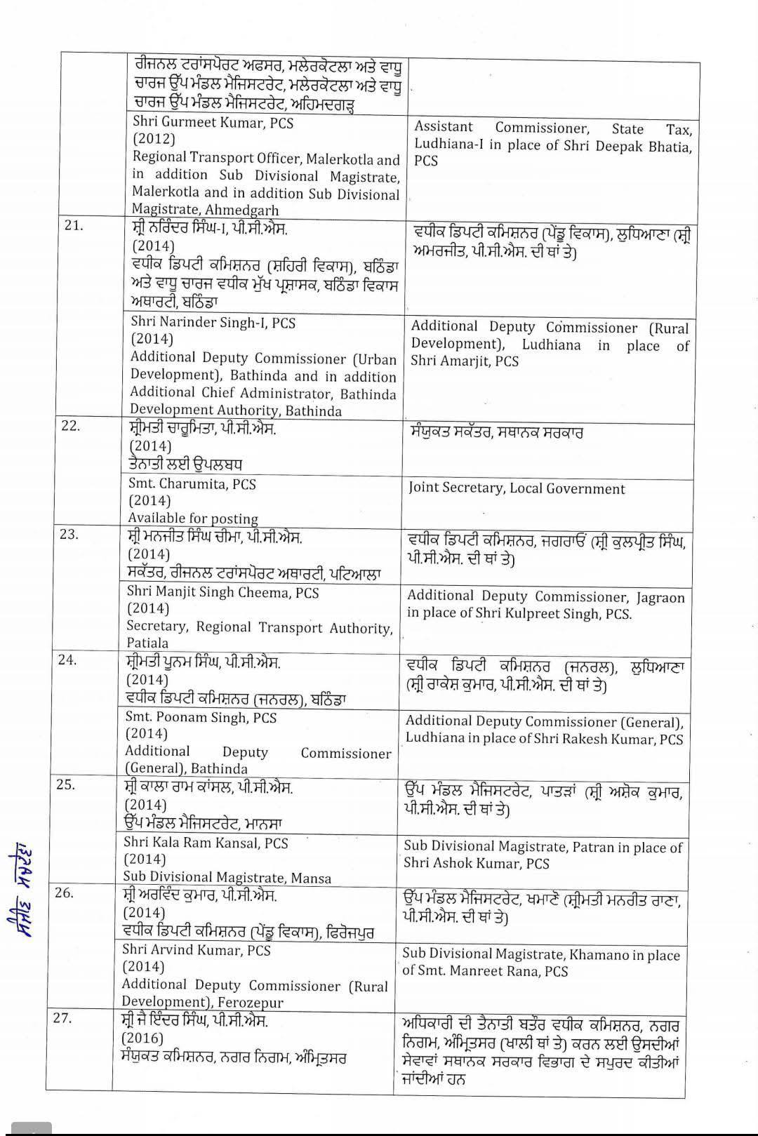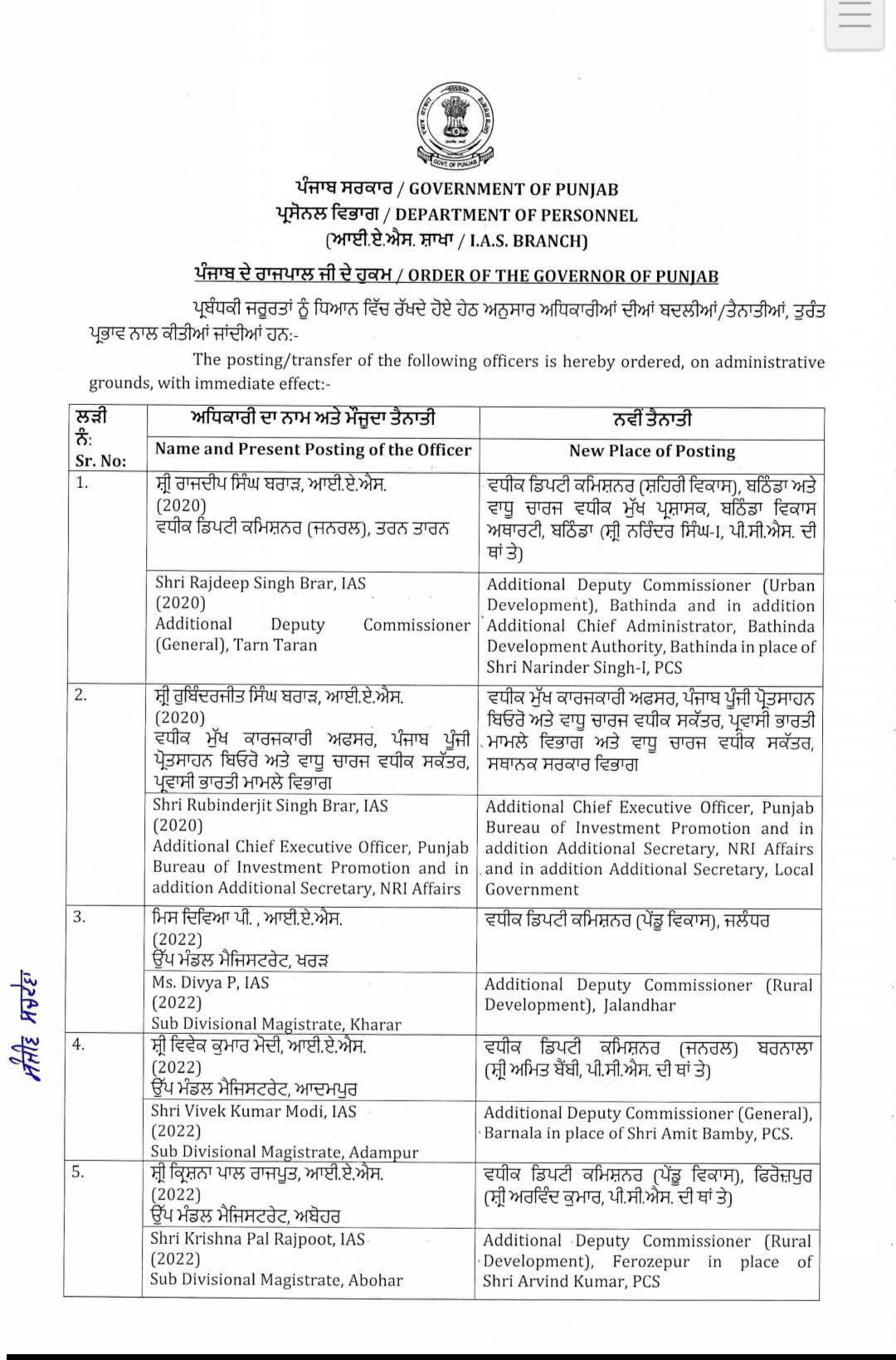 आईएएस राजदीप सिंह बराड़ को अतिरिक्त उपायुक्त (शहरी विकास) बठिंडा और अतिरिक्त मुख्य प्रशासक, बठिंडा विकास प्राधिकरण नियुक्त किया गया है। वहीं आईएएस रुबिंदरजीत सिंह बराड़ को अतिरिक्त मुख्य कार्यकारी अधिकारी, पंजाब ब्यूरो ऑफ इन्वेस्टमेंट प्रमोशन के साथ अतिरिक्त सचिव, एनआरआई मामले और स्थानीय सरकार की जिम्मेदारी दी गई है।