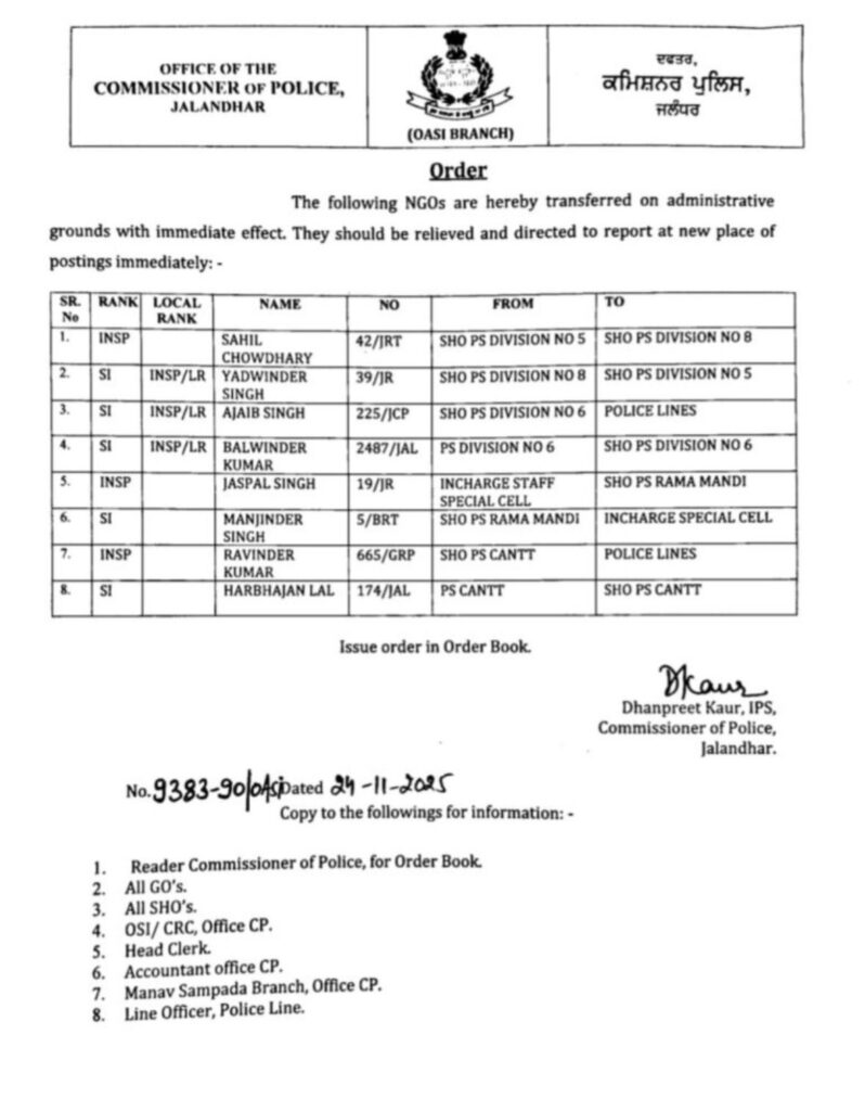 जालंधर पुलिस में बड़ा बदलाव, कई इंस्पेक्टर बदले—दो लाइन हाज़िर