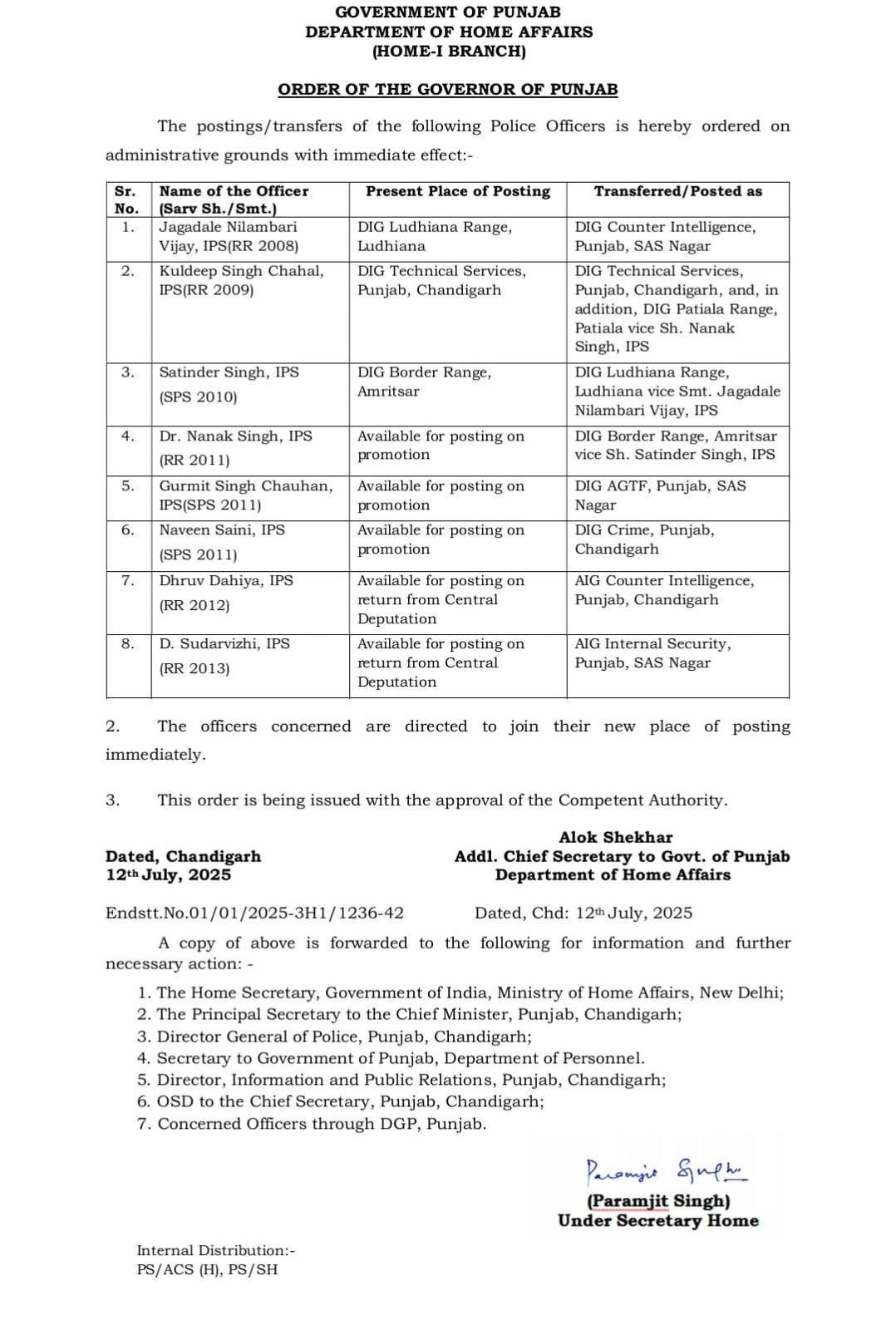 pb8 live news : पंजाब सरकार द्वारा फेरबदल का दौर लगातार जारी है। इसी बीच एक बार फिर सरकार ने पुलिस विभाग में फेरबदल किया है। जारी हुई सूची के मुताबिक, DIG रैंक के 8 सीनियर अधिकारियों को तबादले व नई तैनातियां की गई है। जारी हुई इन आदेशों को तुरन्त लागू करने के लिए कहा गया है। सूची के मुताबिक, नीलांबरी विजय जगदाले, कुलदीप सिंह चहल, सतिंदर सिंह, गुरमीत सिंह चौहान, ध्रूव दहिया, नवीन सैनी, डी. सुदरविझी, डॉ. नानक सिंह के तबादले हुए हैं।
