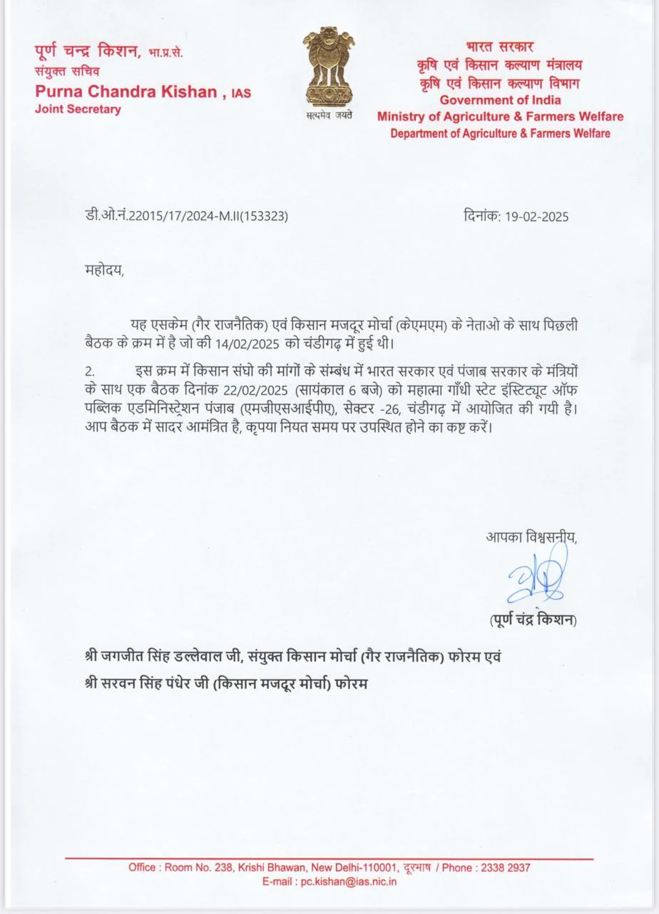pb8 live news : केंद्र और किसानों के बीच 22 फरवरी को होने वाली बैठक अब चंडीगढ़ के सेक्टर 26 स्थित महात्मा गांधी संस्थान में होगी। इससे पहले किसानों ने मांग की थी कि यह बैठक दिल्ली में आयोजित की जाए। उल्लेखनीय है कि 22 फरवरी को होने वाली इस बैठक में केंद्रीय कृषि मंत्री शिवराज चौहान भी शामिल होंगे।आपको बता दें कि संयुक्त किसान मोर्चा (अराजनीतिक) और किसान मजदूर मोर्चा को केंद्र की तरफ से दूसरी बैठक के लिए आमंत्रण पत्र मिला है। केंद्र के साथ किसानों की दूसरी बैठक 22 फरवरी को होगी। यह बैठक चंडीगढ़ के सेक्टर 26 में शाम 6 बजे होगी। आपको बता दें कि केंद्र की ओर से यह पत्र केंद्रीय कृषि मंत्रालय के संयुक्त सचिव पूरन चंद्र किशन की ओर से आया है। किसान नेता जगजीत सिंह दल्लेवाल ने भी बैठक की पुष्टि की है।