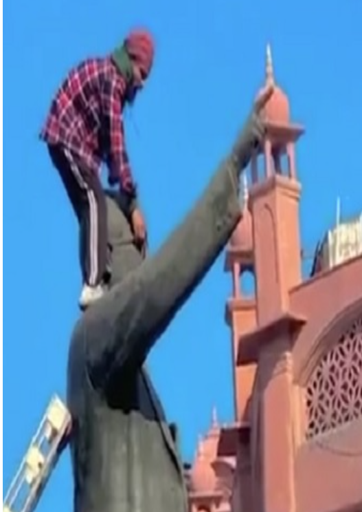 गणतंत्र दिवस पर पंजाब के अमृतसर में माहौल खराब करने की कोशिश की गई है। अमृतसर में बाबा अम्बेडकर की मूर्ति के साथ बेअदबी की गई है। जानकारी के अनुसार गणतंत्र दिवस पर युवक ने डॉ. भीमारव अंबेडकर की प्रतिमा तोड़ा। बताया जा रहा है कि युवक मालापर्ण के लिए जो सीढ़ी लगाई गई थी उस पर चढ़ गया और हथौड़े से प्रतिमा पर लगातार 8 वार कर मूर्ति को नुकसान पहुंचाया। वहीं यह भी बताया जा रहा है कि व्यक्ति ने पहले प्रतिमा के पास रखी संविधान की मूर्ति को भी आग लगाई। इस घटना के बाद अमृतसर में माहौल गरमाया हुआ है जिसके चलते भारी पुलिस बल भी तैनात है। हेरिटेज स्ट्रीट होने के चलते वहां लोगों का आना-जाना चल रहा था। लोगों की जब इस युवक को मूर्ति पर हथौड़े से वार करते देखा तो उसे नीचे आने के लिए कहा लेकिन वह ऊपर बैठा ही लोगों से बहस करने लगा और नीचे आने से मना किया। इसके बाद वह किसी तरह नीचे आया तो वहां खड़े सिक्योरिटी गार्डों ने उसे पकड़ लिया। जब गार्ड उसे लेकर जाने लगे तो भीड़ में किसी ने उसे थप्पड़ मार दिया। गुस्से में आए आरोपी व्यक्ति ने कहा कि उसे मारना मत। फिलहाल पुलिस उसे थाने ले गई है। घटना को अंजाम देने वाले शख्स की पहचान प्रकाश निवासी धर्मकोट अमृतसर के रूप में हुई है जो खुद दलित समाज का बताया जा रहा है।