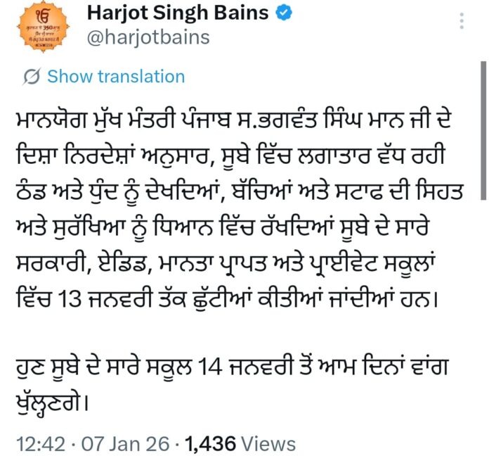 पंजाब में बढ़ती सर्दी को देखते हुए राज्य सरकार ने स्कूलों की छुट्टियाँ एक बार फिर बढ़ाने का निर्णय लिया है। इस संबंध में शिक्षा मंत्री हरजोत बैंस ने जानकारी दी कि मुख्यमंत्री भगवंत मान के निर्देश पर पंजाब के सभी सरकारी, प्राइवेट, एडेड और मान्यता प्राप्त स्कूल अब 13 जनवरी तक बंद रहेंगे। उन्होंने बताया कि नियमित कक्षाएँ 14 जनवरी से दोबारा शुरू होंगी। सरकार ने यह फैसला छात्रों की सुरक्षा और स्वास्थ्य को ध्यान में रखते हुए लिया है।