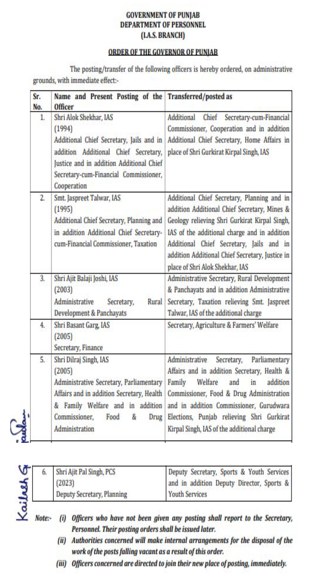pb8 live news : पंजाब में प्रशासनिक फेरबदल का दौर लगातार जारी है। पंजाब सरकार के नए आदेशों पर 6 आईएएस व पीसीएस अधिकारियों के तबादले किए गए हैं। जारी हुई सूची के अनुसार 5 आईएएस व 1 पीसीएस अधिकारी का तबादला किया गया है। बता दें कि आज सुबह ही पंजाब सरकार ने भ्रष्टाचार के खिलाफ बड़ी कार्रवाईकी है। 191 पंजाब पुलिस थानों के मुंशियों का तबादला किया है।