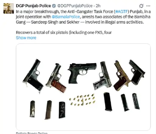 पंजाब के बरनाला में एंटी गैंगस्टर टास्क फोर्स (AGTF) ने बड़ी कार्रवाई करते हुए बंबीहा गैंग से जुड़े दो शातिर बदमाशों — संदीप सिंह और शेखर — को गिरफ्तार किया है। पुलिस ने उनके कब्जे से 6 पिस्टल और 19 कारतूस बरामद किए हैं।