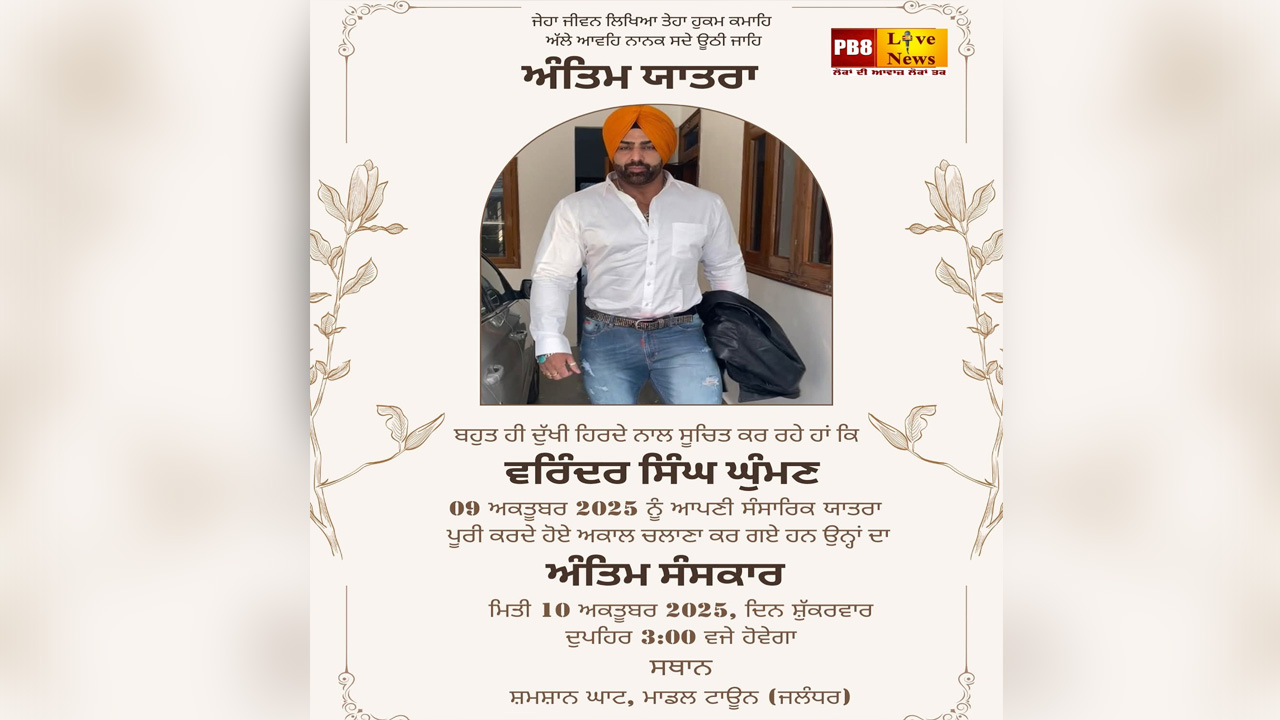 पंजाब के मशहूर बॉडी बिल्डर और अभिनेता वरिंदर घुम्मण का अंतिम संस्कार आज (शुक्रवार) दोपहर 3 बजे जालंधर के मॉडल टाउन श्मशान घाट में किया जाएगा। गुरुवार को हार्ट अटैक के कारण उनका निधन हो गया था। उनके निधन से फिटनेस और फिल्म जगत में शोक की लहर है।